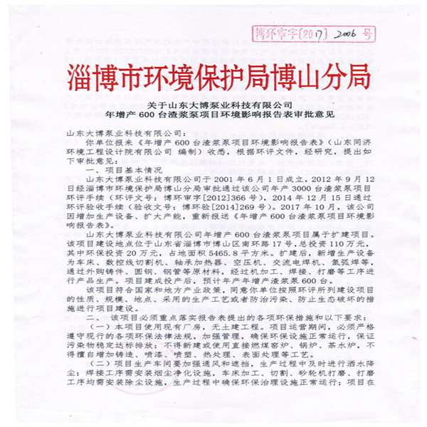 山東大博泵業(yè)科技有限公司現(xiàn)有《年產(chǎn)3000臺(tái)渣漿泵項(xiàng)目》已通過淄博市環(huán)境保護(hù)局博山分局審批、驗(yàn)收,《年增產(chǎn)600臺(tái)渣漿泵項(xiàng)目》于2017年11月通過淄博市環(huán)境保護(hù)局博山分局審批(博環(huán)審字[2017]2006號(hào)),并于20